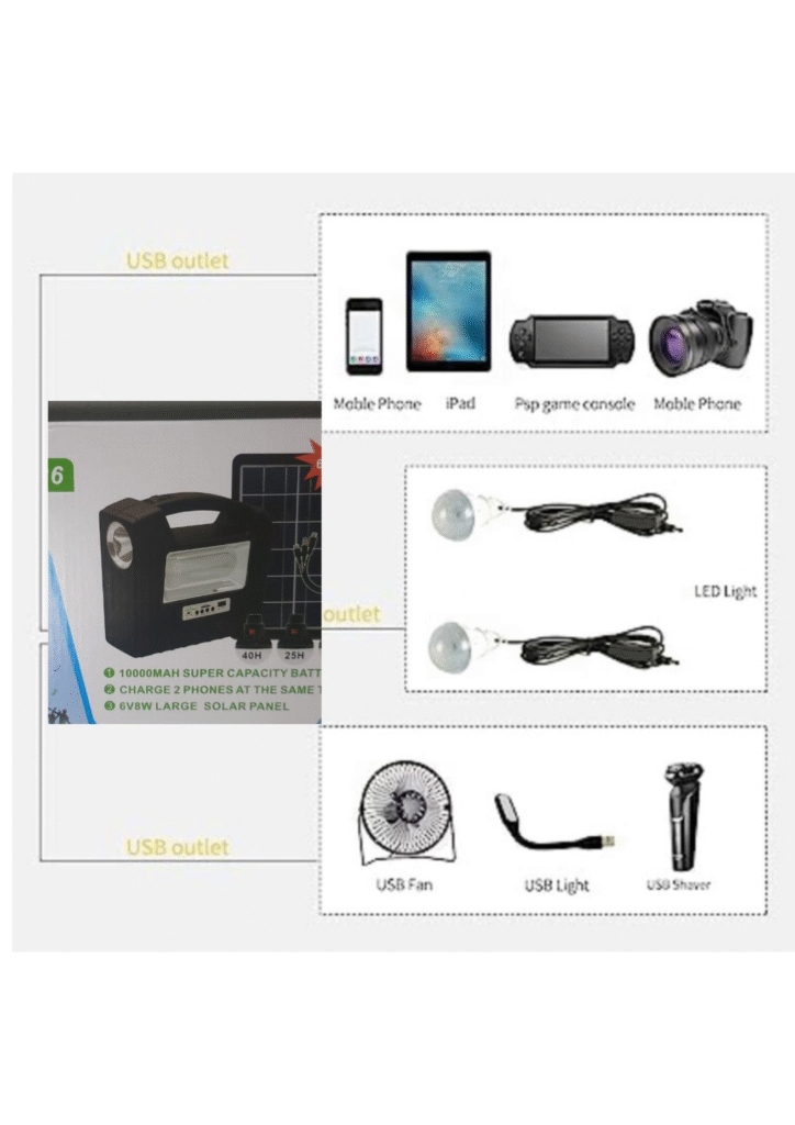 Ignite Your World With Our Multi-Functional Solar Generator! This Portable Powerhouse Ensures Efficient Portability Without Compromising On Power. It Light Up 3 bulbs, Cool Your Fan, And Charge Up To 3 Phones At A Time.